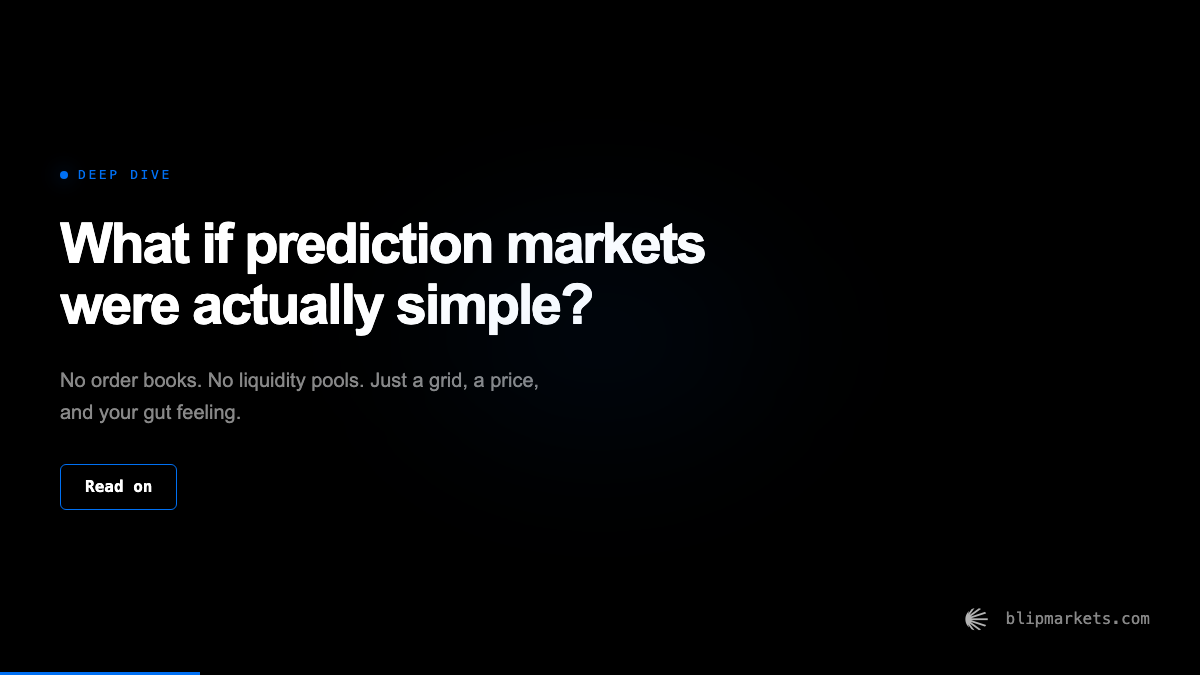 It started at ETHGlobal HackMoney. I built the first version of Blip Markets during the hackathon, won, and became an ETHGlobal finalist. That validation told me the idea had legs.