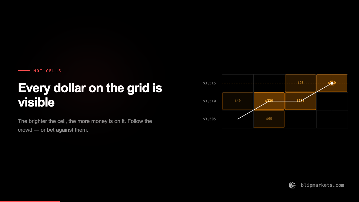 The grid has a live heatmap. When someone stakes on a cell, it lights up orange. More money on a cell = brighter the glow. We call them Hot Cells.