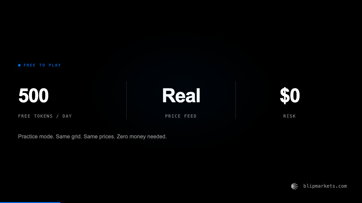 Same grid. Same real-time Coinbase prices. Same settlement logic. The only difference: you're using free tokens. 500 of them, every day, automatically.