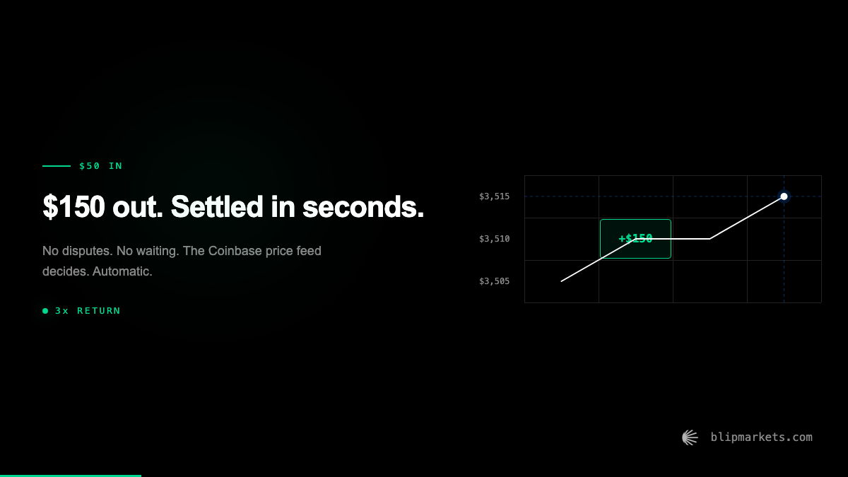 $50 in. Price touches your cell. $150 out. Settled in seconds. No disputes. The Coinbase price feed is the only judge.